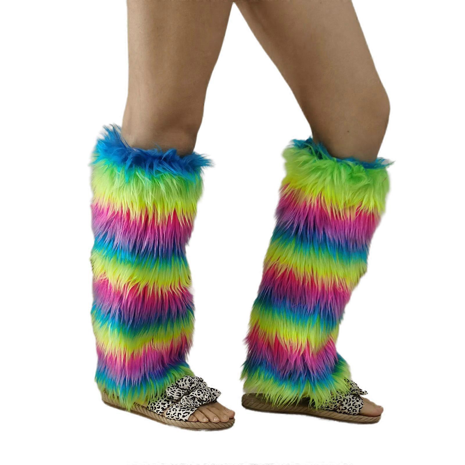 Women Girls 80s Party Vintage Rainbow Plush Leg Warmer Aesthetic Punk Fuzzy Thickened Boot Cuffs Leg Cover Long Socks E40