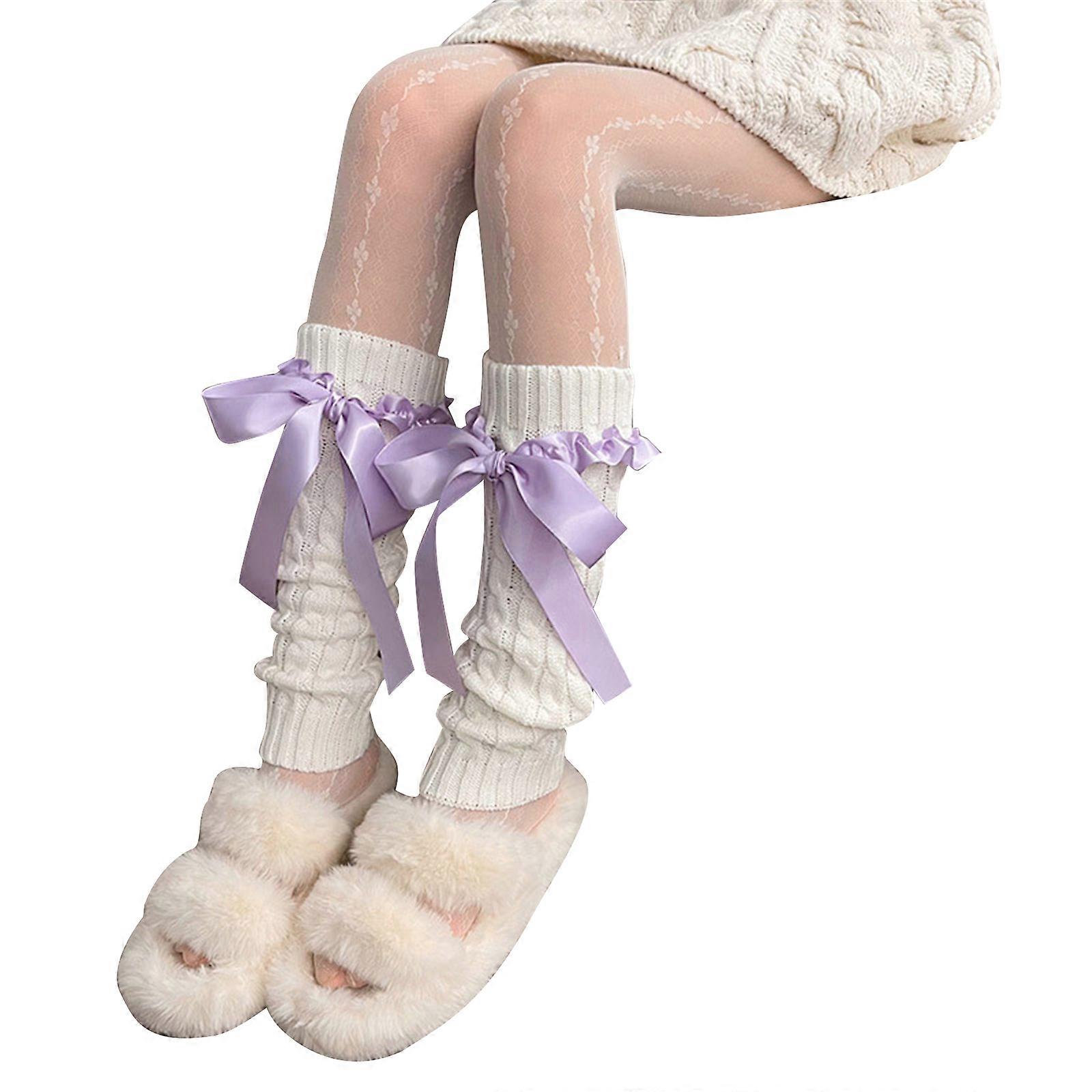Women Japanese Style Ruffle Knitted Long Leg Warmers Knee High Boot Stockings Ballet Style Bow Lace Up Leg Sover Socks White socks purple b