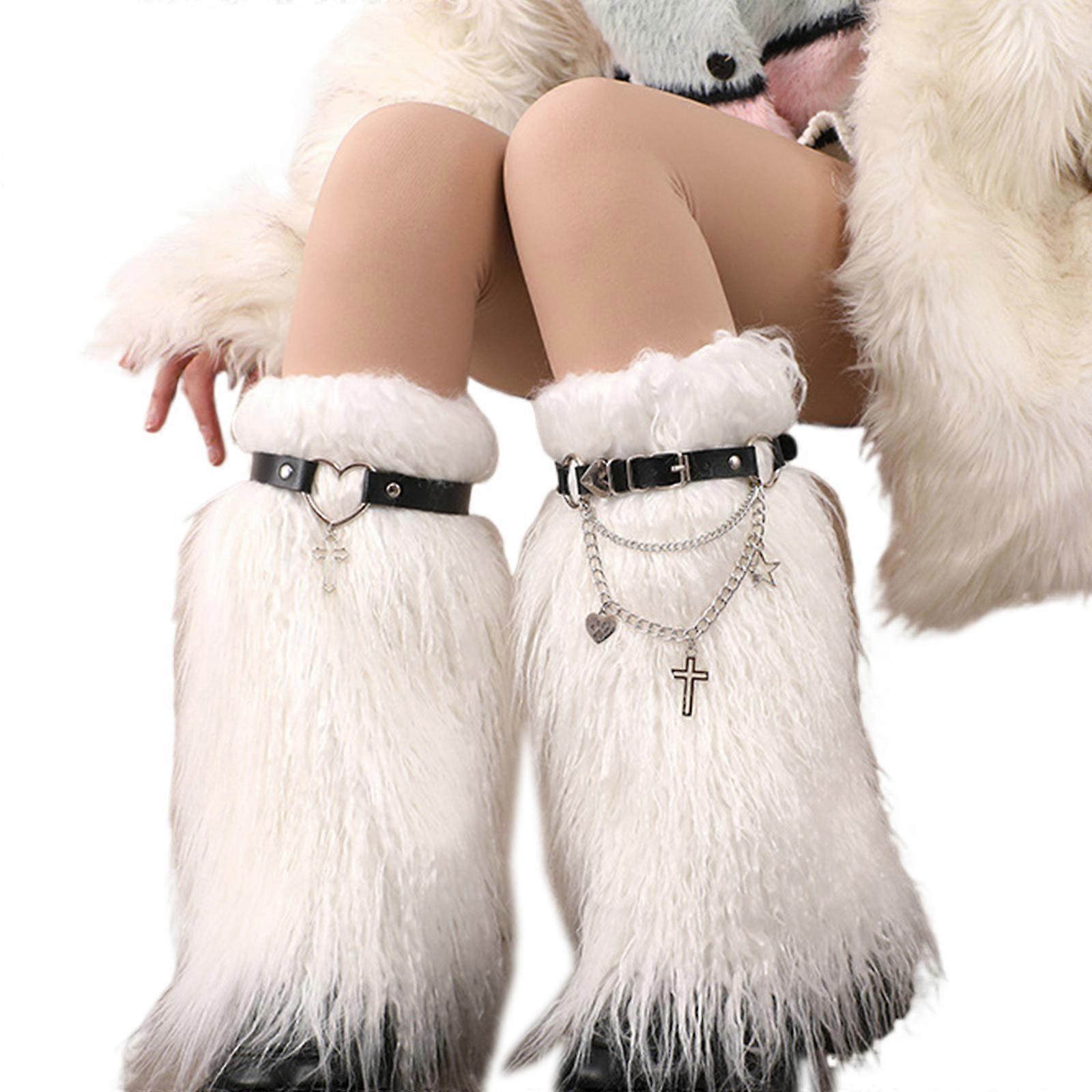Women Gothic Punk Plush Leg Warmer Fuzzy Boot Cuffs Cosplay Leg Cover Socks with Heart Chain Leather Garter Belt Set Silver
