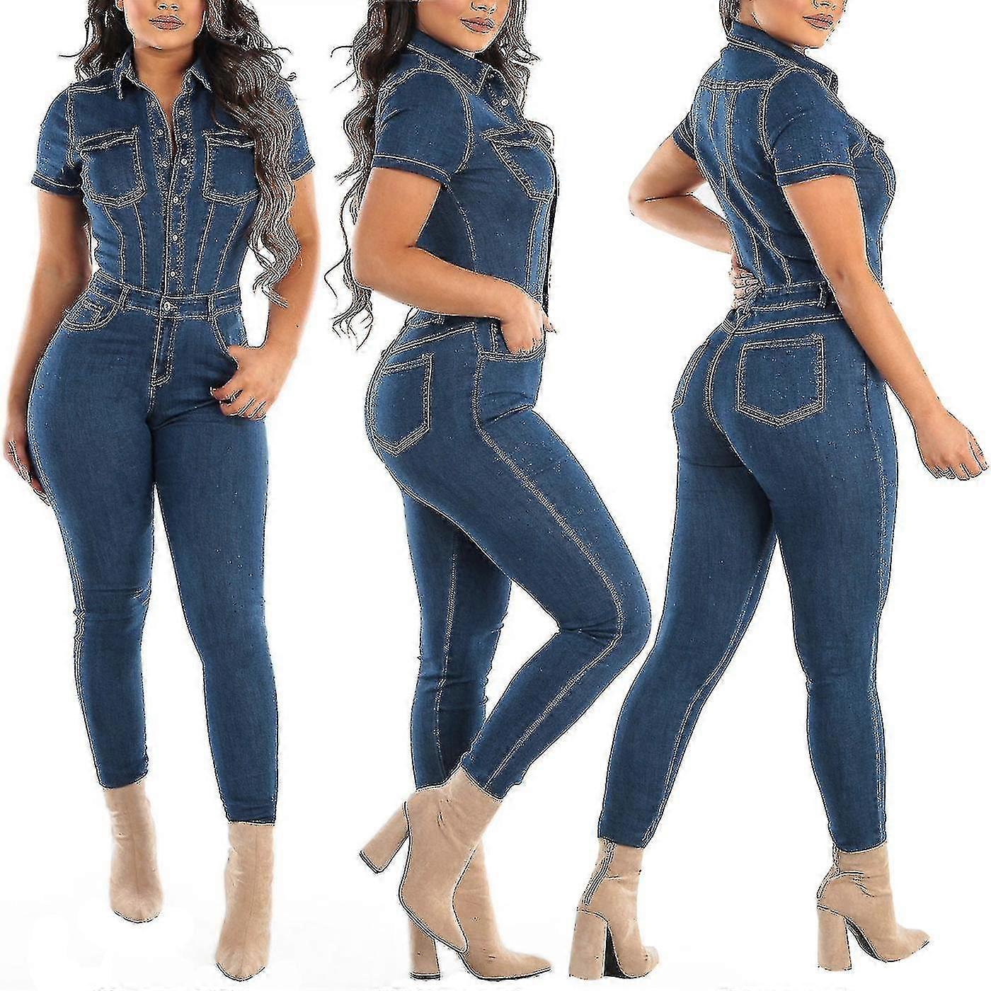 Women Denim Jumpsuit Short Sleeve Turn-down Collar Single Breasted Casual Jeans Rompers Overalls