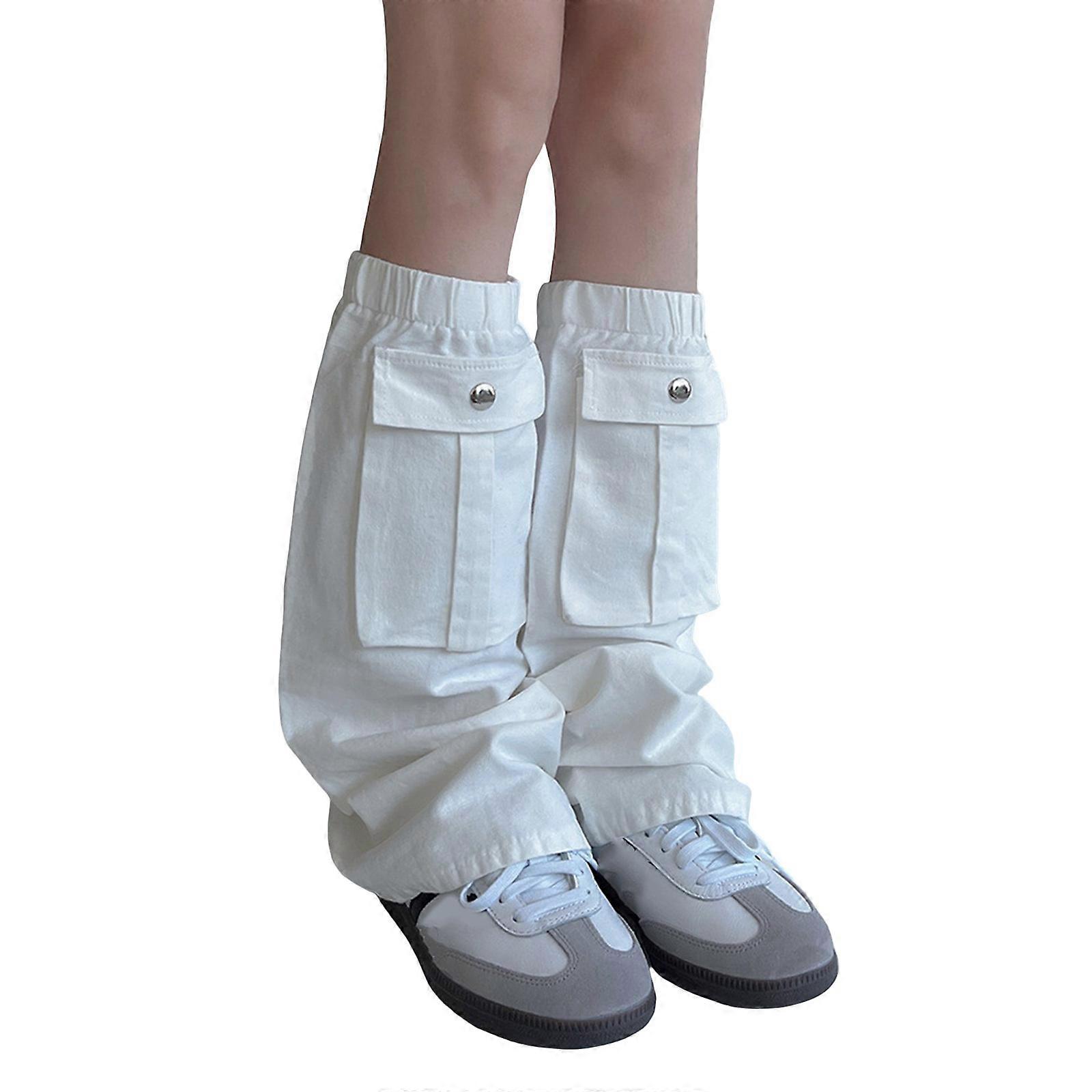 Women Harajuku Cargo Leg Warmers with Pocket Punk Flared Calf Socks Grunge Baggy Oversized Loose Foot Covers Streetwear White