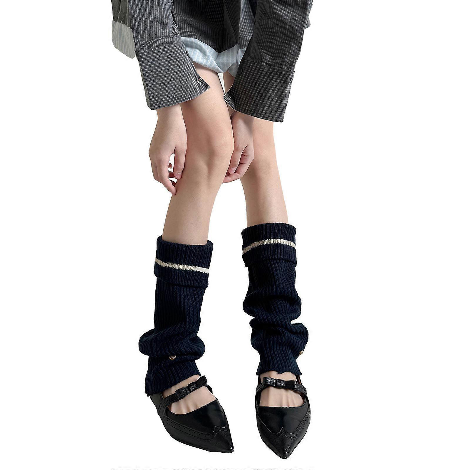 Women Harajuku Ribbed Knitted Leg Warmers with Metal Button Elegant Turn Cuff Striped Boot Covers Flared Calf Socks Navy blue
