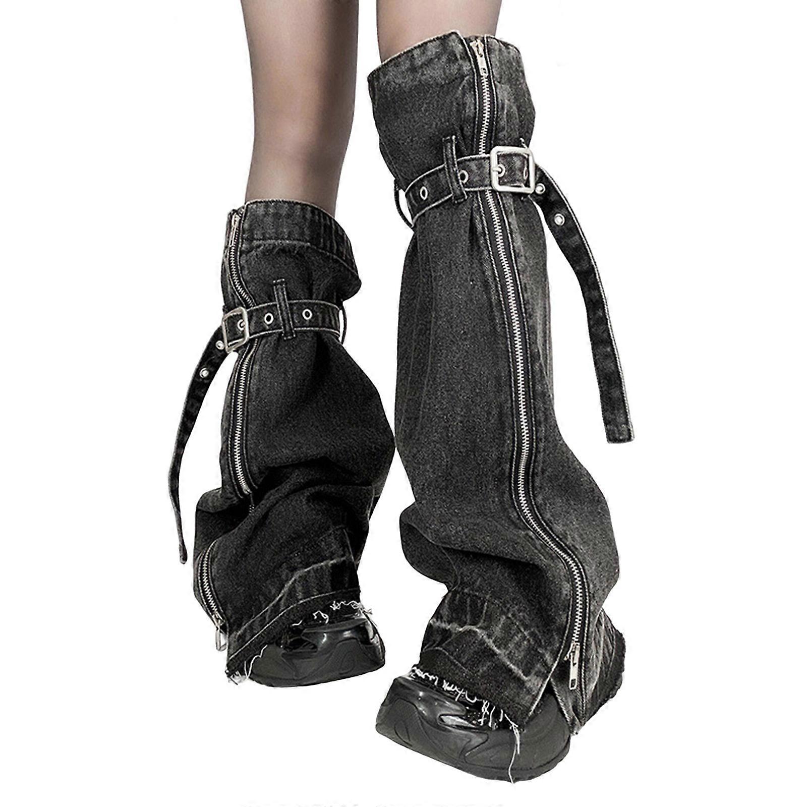 Women Harajuku Punk Side Zippers Jeans Baggy Leg Warmer Long Socks Washed Denims Flared Boot Covers with Buckled Straps Dark Grey