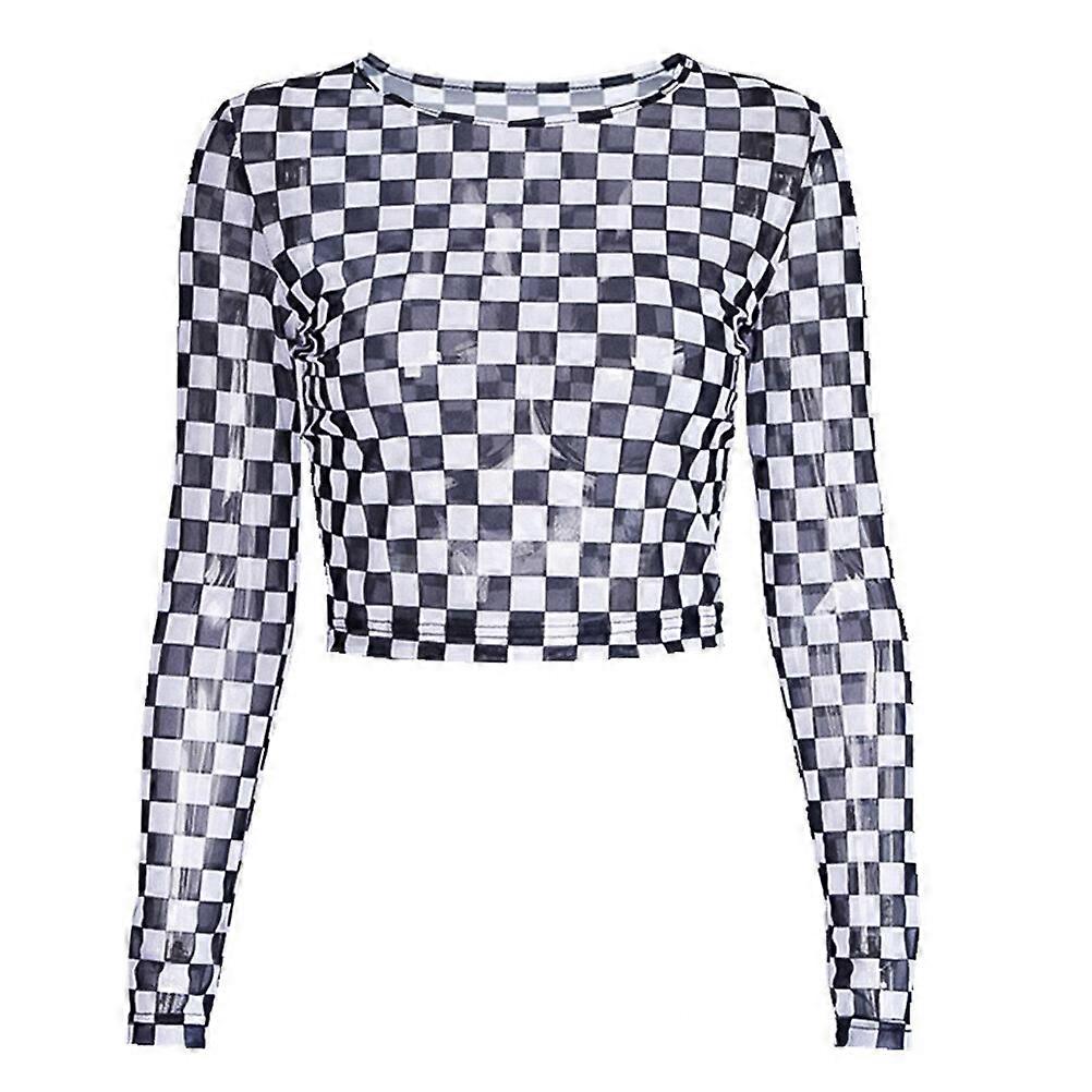 Women Vintage T-Shirt Perspective Round Collar Mesh Retro Skinny T-Shirt