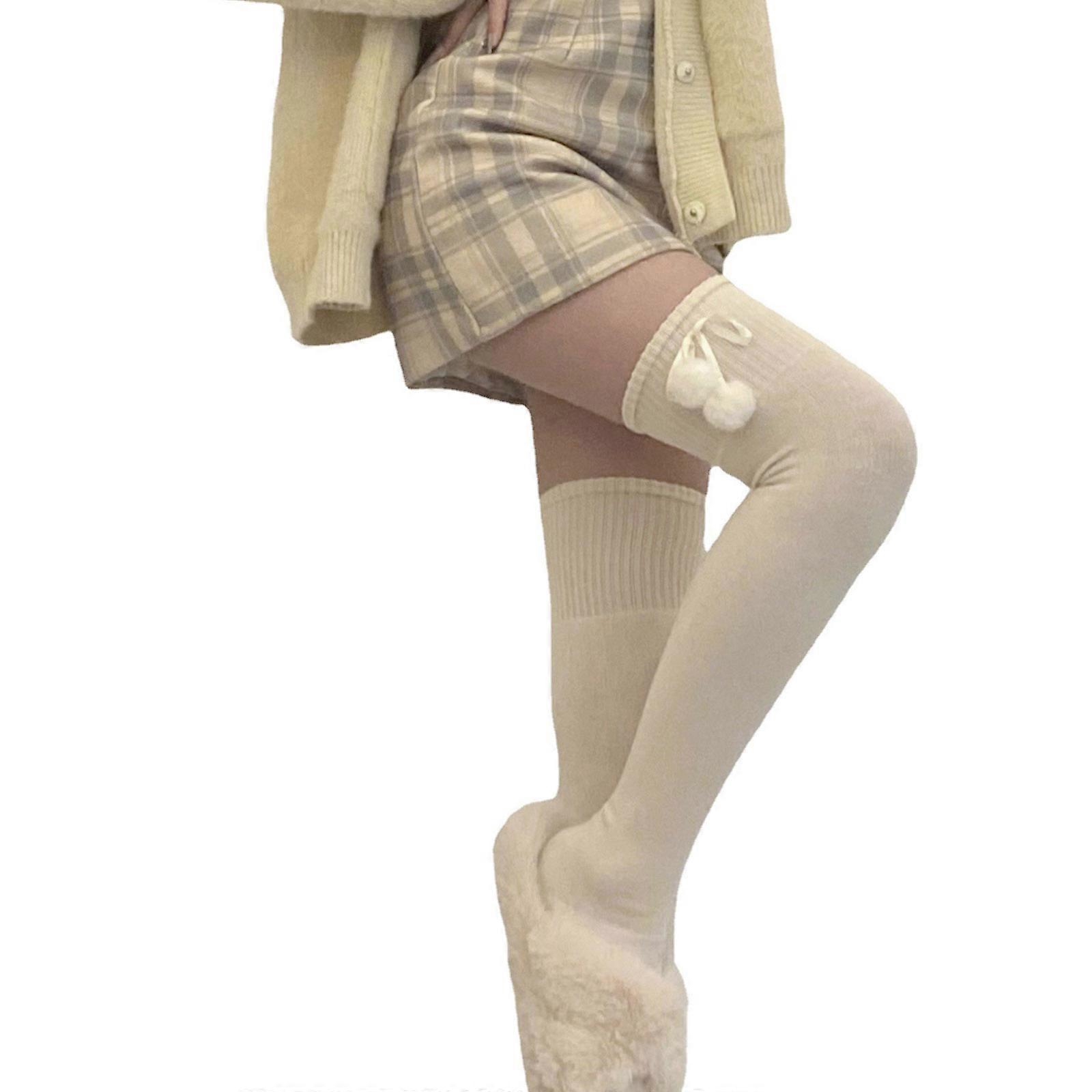 Women Winter Warm Faux Wool Knit Thigh High Stockings with Cute Plush Hair Ball Bowknot Solid Color Lolita Kawaii Over Knee Long Socks Leg Warmers