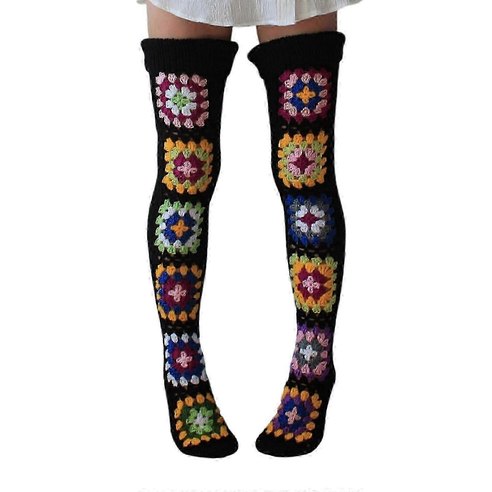 Womens Winter Fall Ethnic Crochet Knitted Colorful Thigh High Boot Socks Long Over The Knee Winter Stockings Leg Warmers White