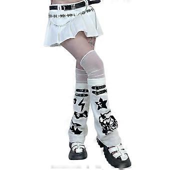 Womens Cute Knitted Leg Warmers Girls Vintage Punk Knee High Leg Socks Gothic Print Stockings for Dress Skirt White With leather buckle