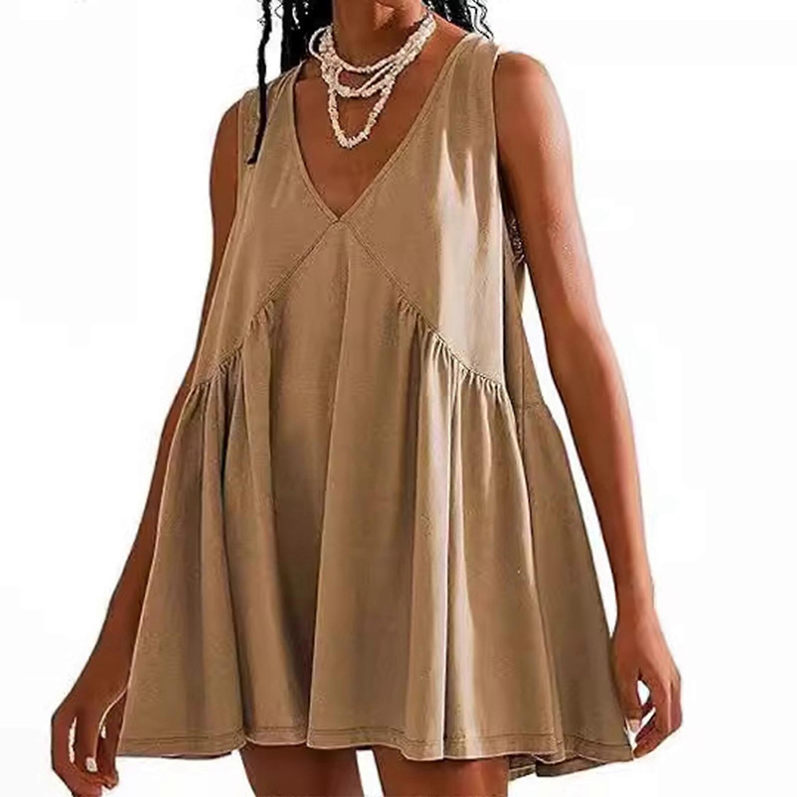 Womens Casual V Neck Sleeveless Solid Loose Swing Mini Tank Dress Beach Summer Pleated A Line Tank Dresses with Pockets XS Khaki