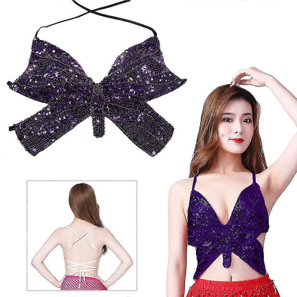 Women Shiny Sexy Halter Back Lace-up Festival Crop Top Belly Dance Beaded Sequin Tops Padded Butterfly Bra