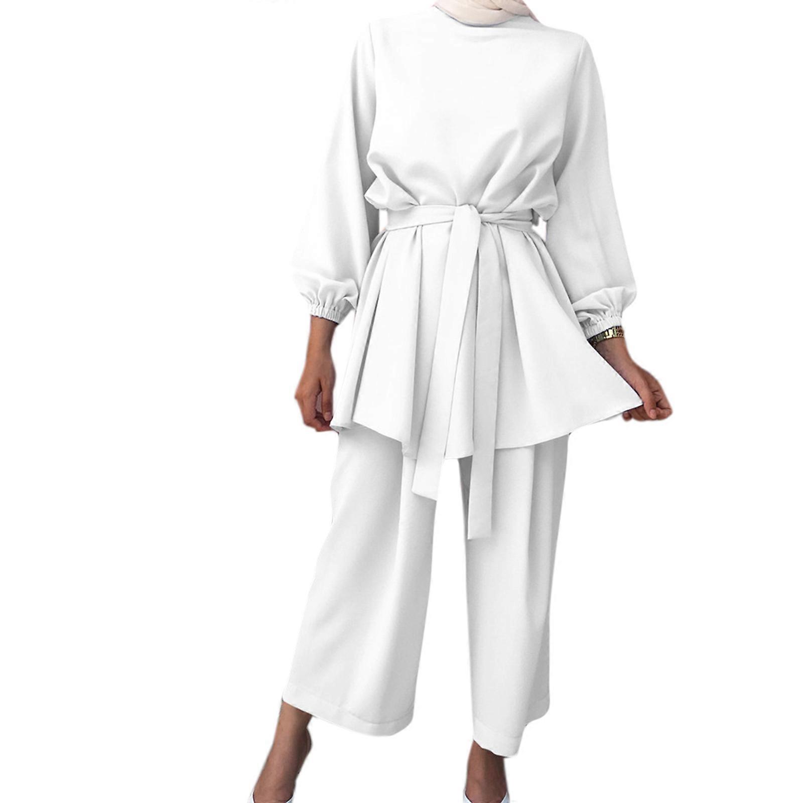 Women Muslim Summer 2Pcs Outfits Set Long Sleeve Belted Tunic Tops Wide Leg Loose Pants Solid Color Dubai Kaftan Hijab White S