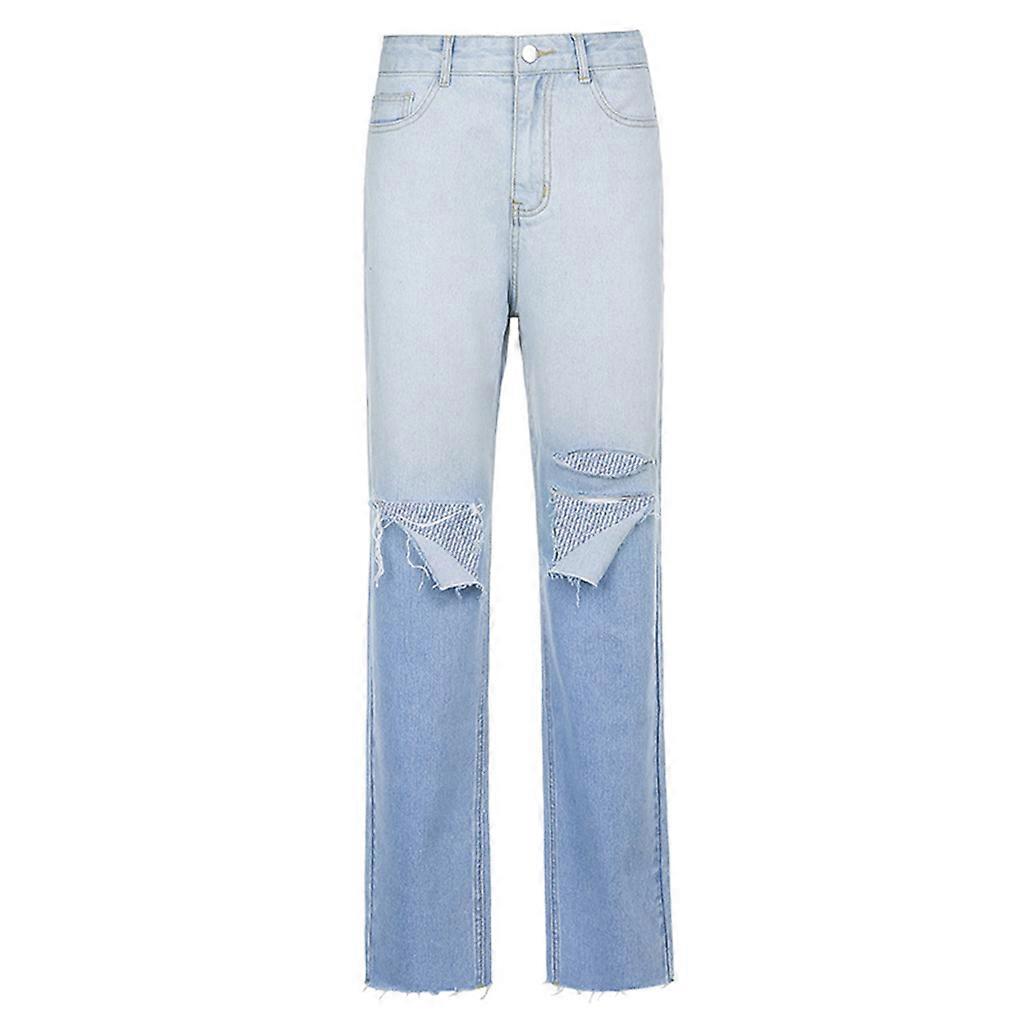 Women High Waist Gradient Blue Color Jeans Vintage Ripped Distressed Hole Denim Pants Harajuku Hip Hop Straight Leg Loose Trousers Streetwear S
