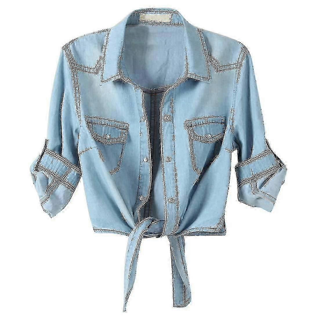 Women's Casual 3/4 Sleeve Button Down Crop Jean Top Knot Tie Denim Shirt Jacket