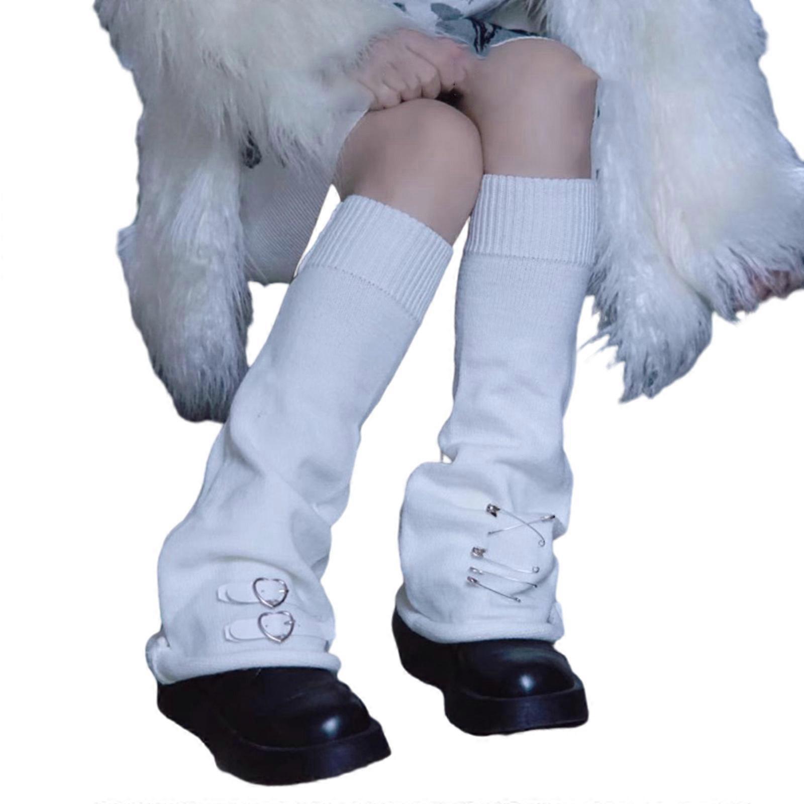 Women Leg Warmers Leather Buckle Knit Long Leg Socks Warm Students Girls 90s Boot Socks Party Casual Y2K Streetwear White