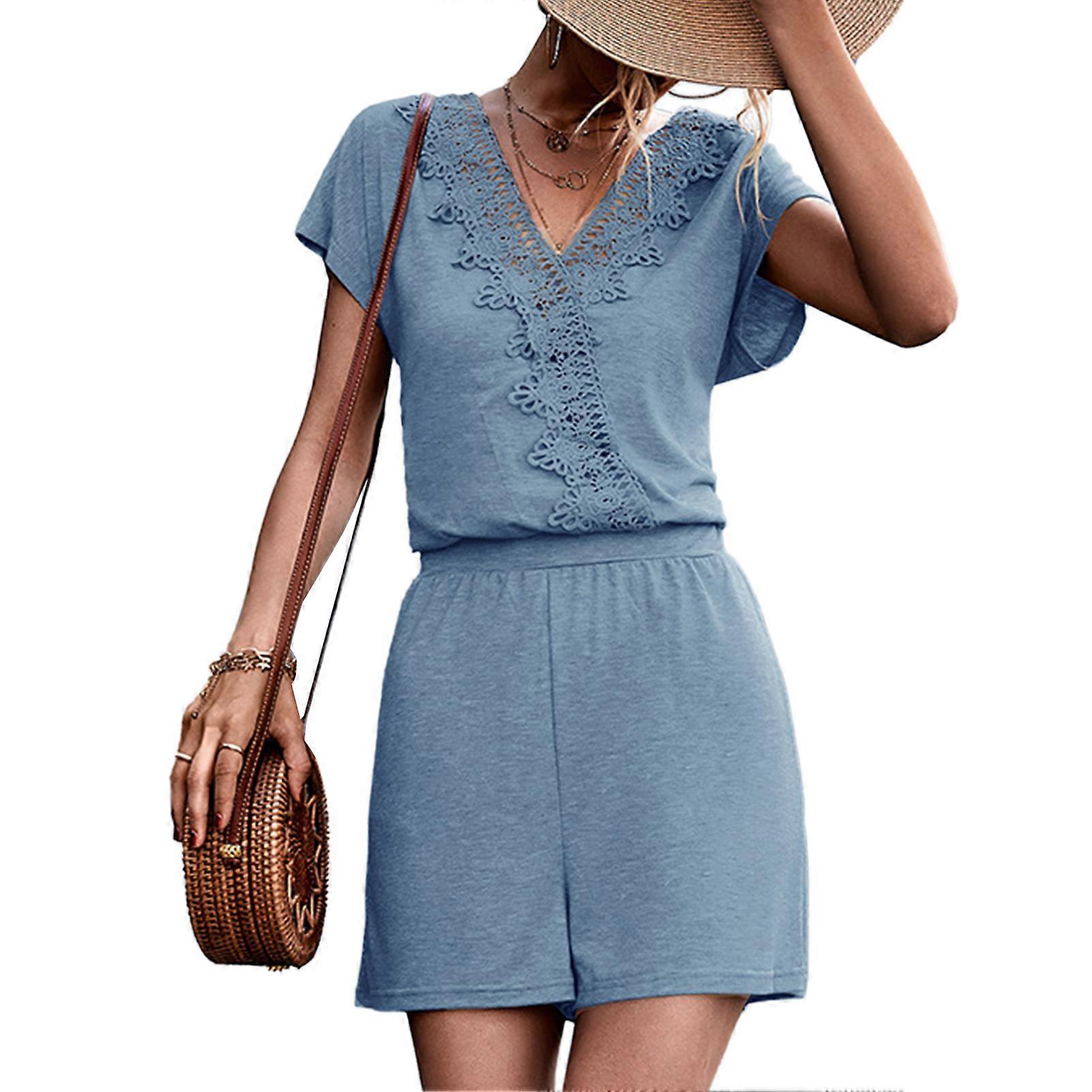 Women V Neck Shorts Jumpsuits Casual Lace Stitching Short Sleeve Front Button Shorts Jumpsuits for Summer Blue L