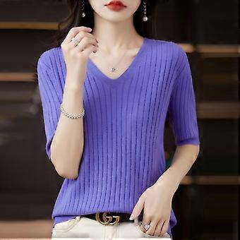 Women Sweater Short Sleeve V-neck Stripe Knitwears Slim Fit Shirt Korean Fashion Pullovers Thin Knit Tops Bottoming Shirts