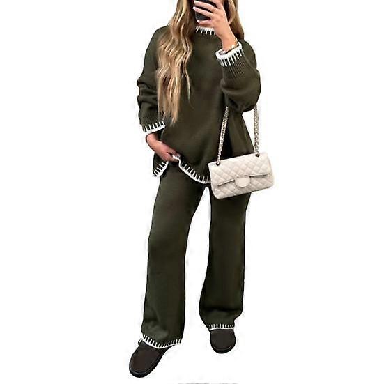 Women Striped Knit Sweater Wide Leg Pants Set Split Pullover Tops Elastic High Waist Straight Pants Two Piece Set Lounge Wear Tracksuits for Autumn
