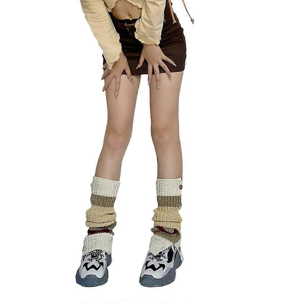 Women Student Leg Warmers Knitted Button Up Contrast Color Striped Calf Socks