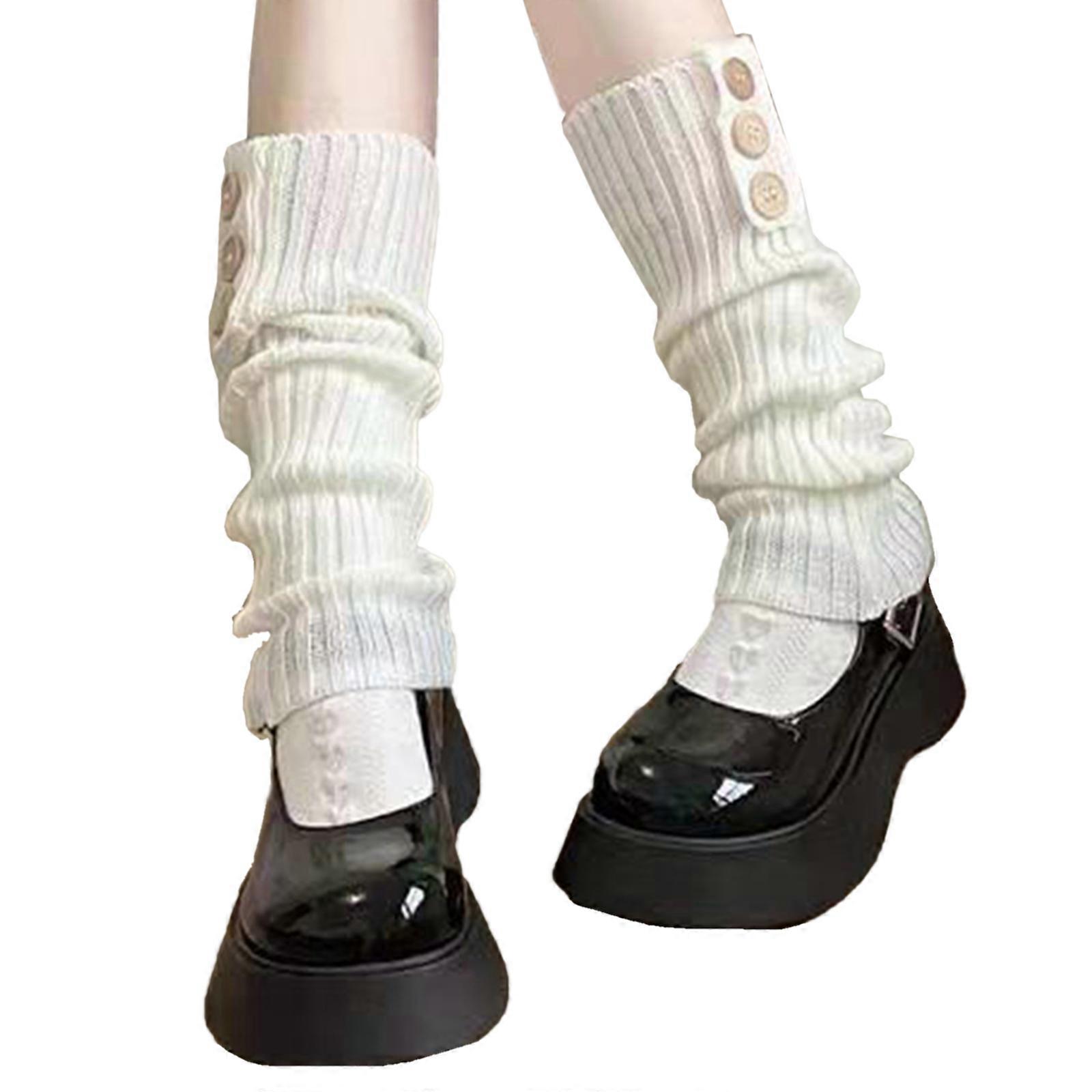 Women Student Novelty Leg Warmers Ribbed Knitted 3 Button Knee High Footless Boot Cuffs Solid Color Foot Covers Socks White