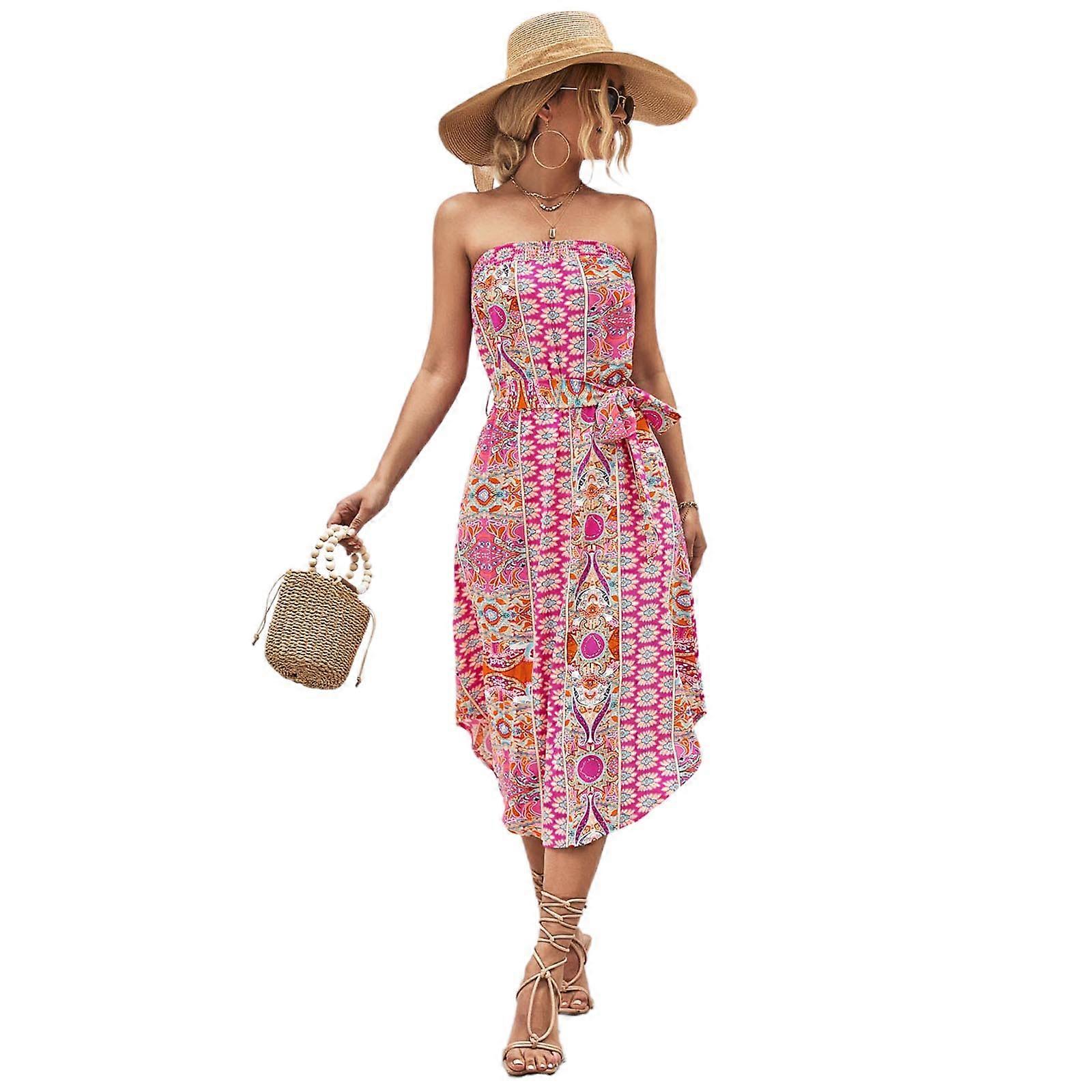 Womens Strapless Floral Tube Dresses Casual Summer Sundress Belted Elegant Midi Dresses for Party Club Pink XL