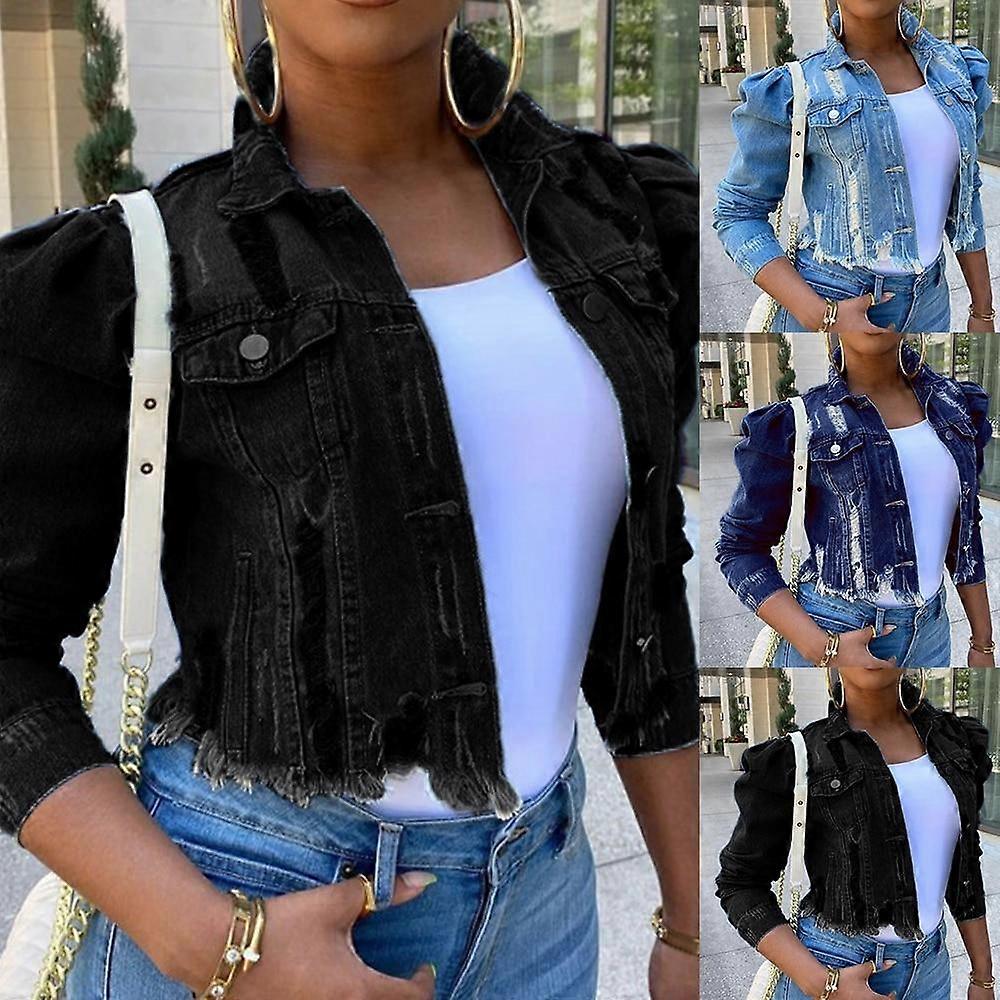 Women Sexy Ripped Denim Jackets Vintage Casual Short Jean Jacket Puff Sleeve Female Coat Streetwear