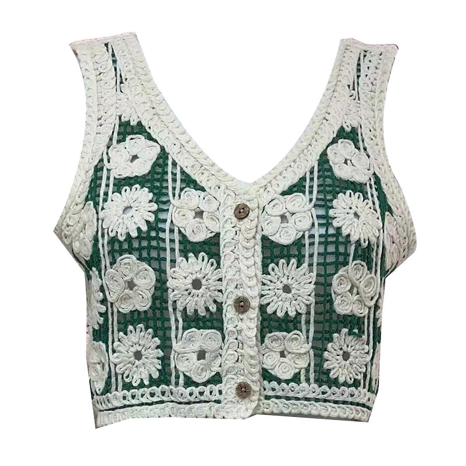 Women Crochet Knit Boho Sleeveless Vest Embroidery Floral Button Crop Cardigan