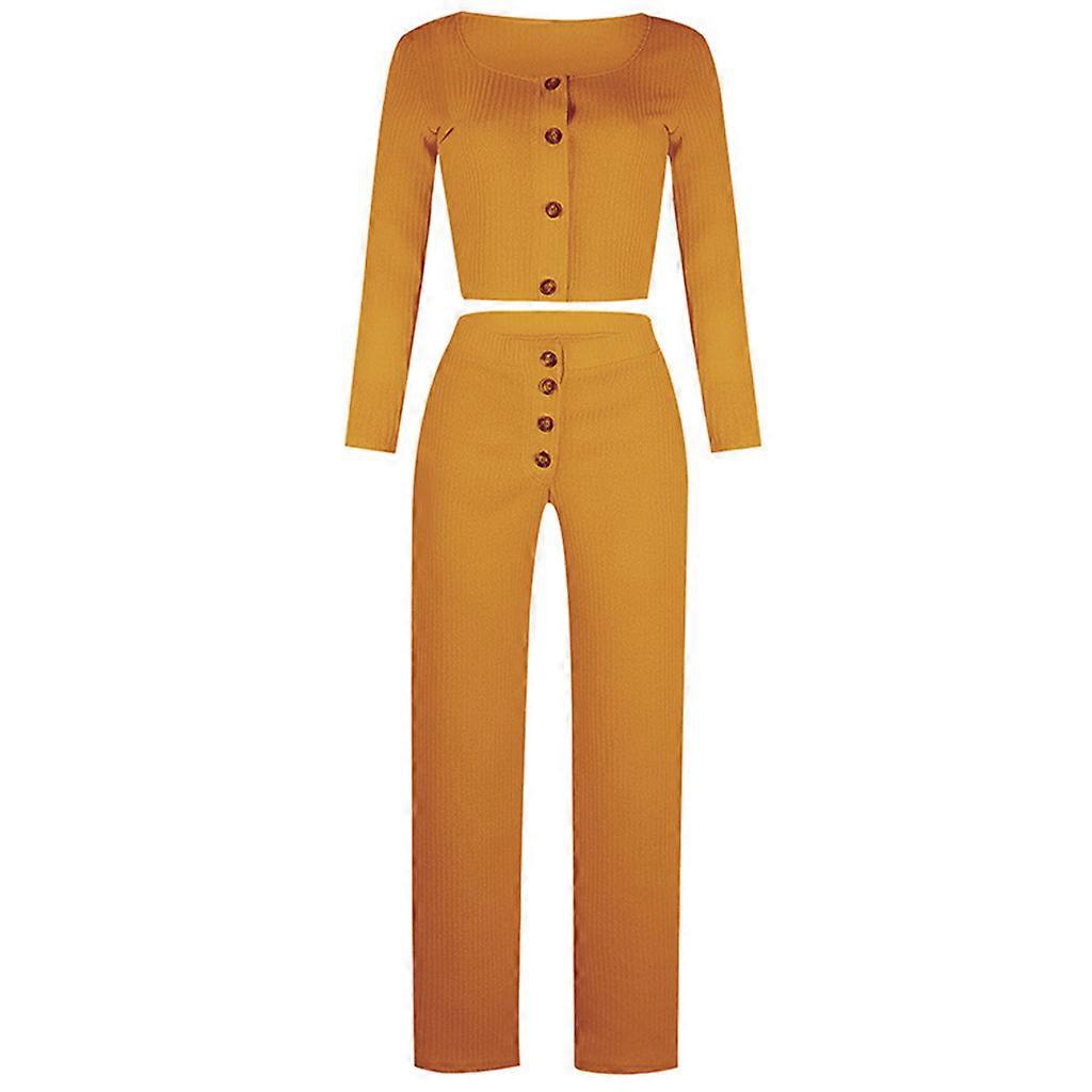 Women Ribbed Knit 2Pcs Solid Outfit Long Sleeve Buttons Crop Top Wide Leg Pants Yellow XL