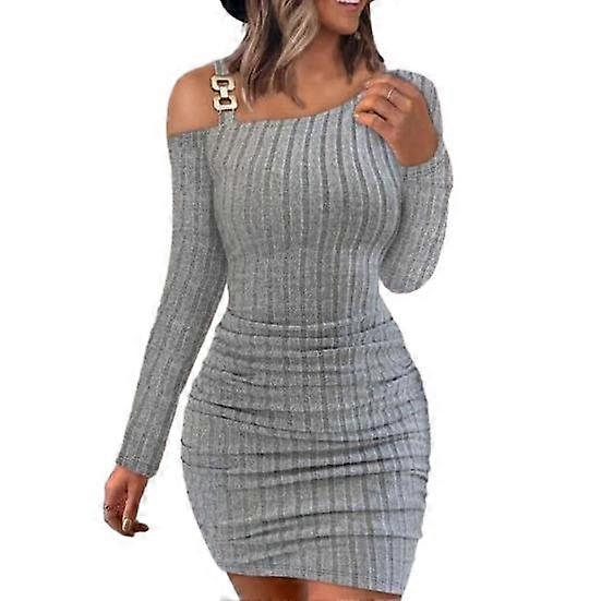 Women Fall Spring Dress Knitted One Shoulder Skinny Elastic Oblique Neck Solid Color Tight Waist Anti-shrink Long Sleeve Mini Sheath Dress Party
