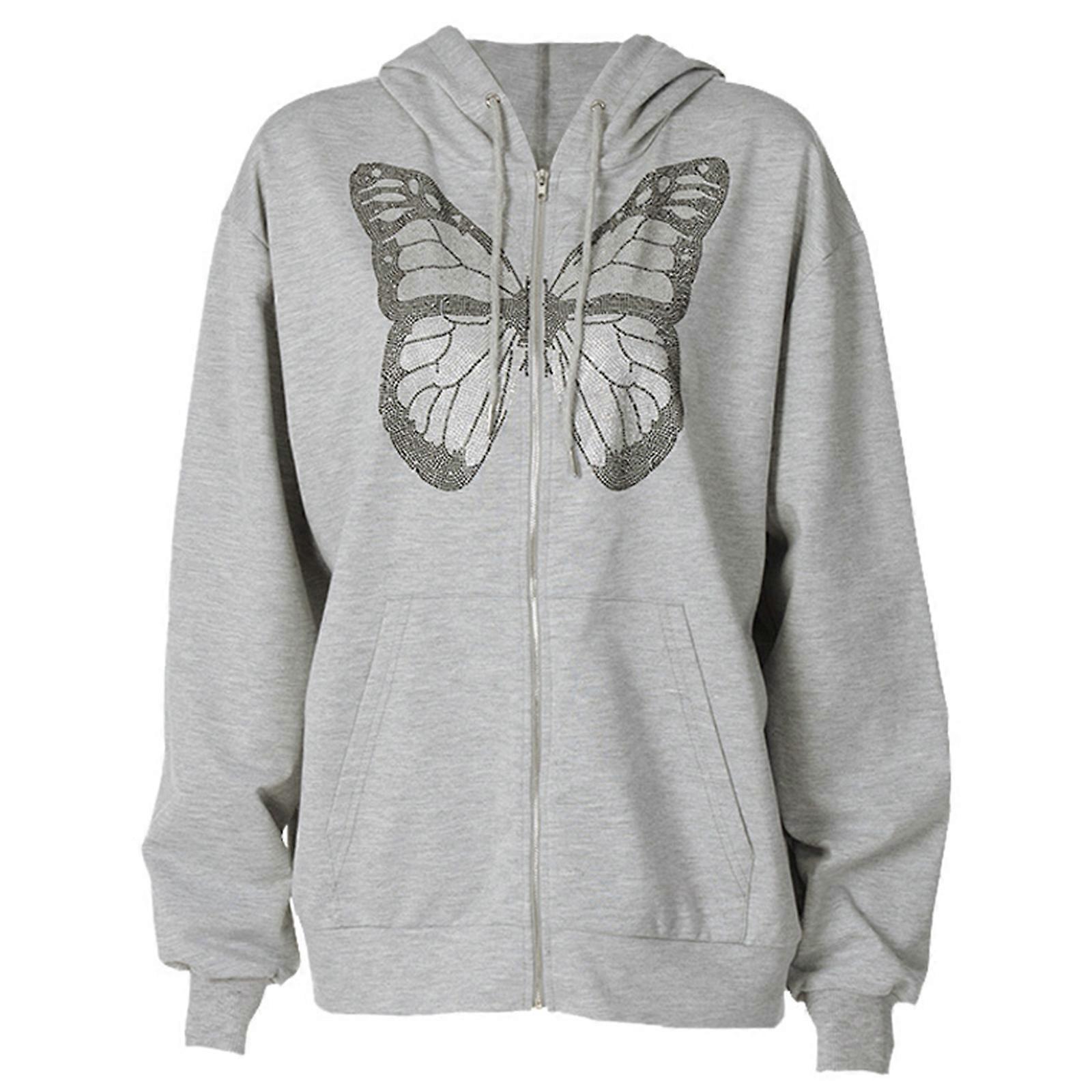 Women Autumn Long Sleeve Gray Hoodies for Jacket Harajuku for Butterfly for Rhinestone Drawstring Sweatshirt Zipper Up Oversized Loose Outwear Coat S