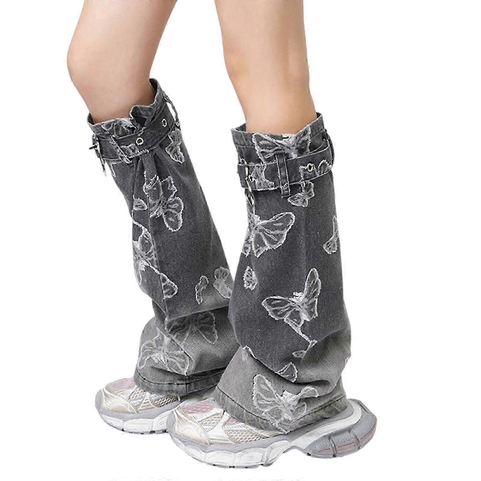 Women Butterfly Jacquard Jeans Leg Warmers with Buckles Punk Gradient Denim Flared Boot Covers Streetwear