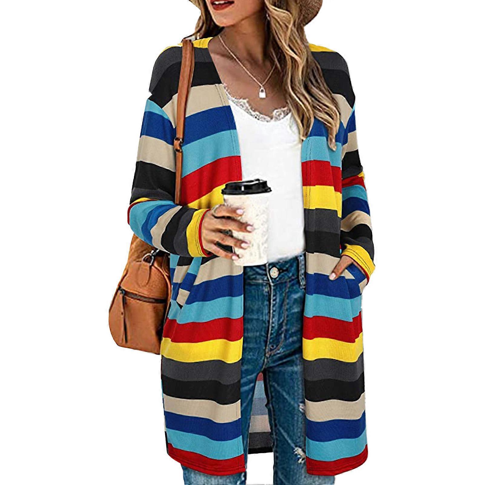 Women Open Front Cardigan Striped Color Block Long Sleeve Casual Sweater Outwear for Fall
