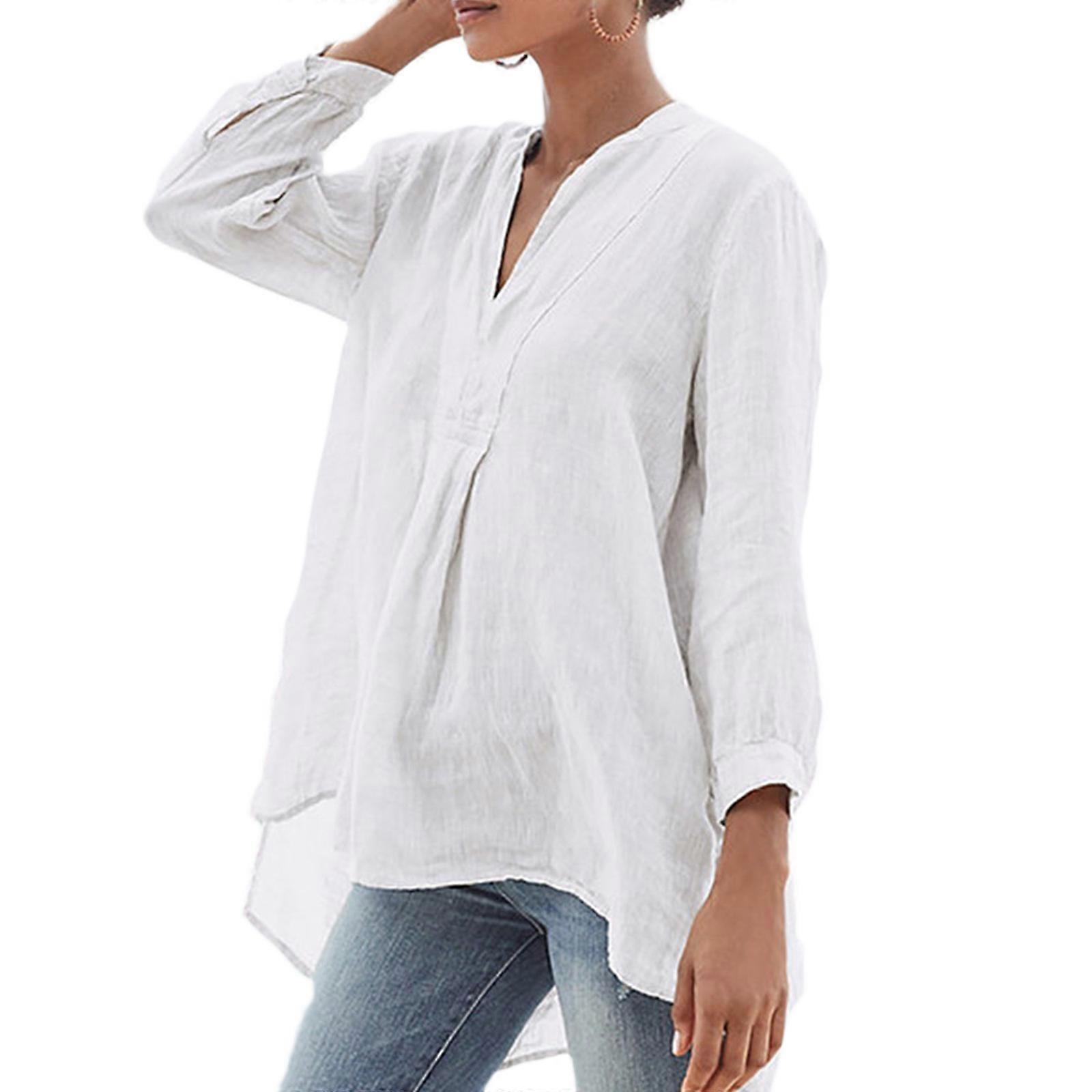 Women Solid Color High Low Hem Casual Loose Tunic Shirt 3/4 Puff Sleeve Pleats V-Neck Beach Linen Blouses Pullover Top White XL