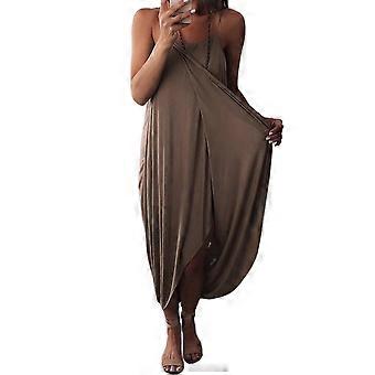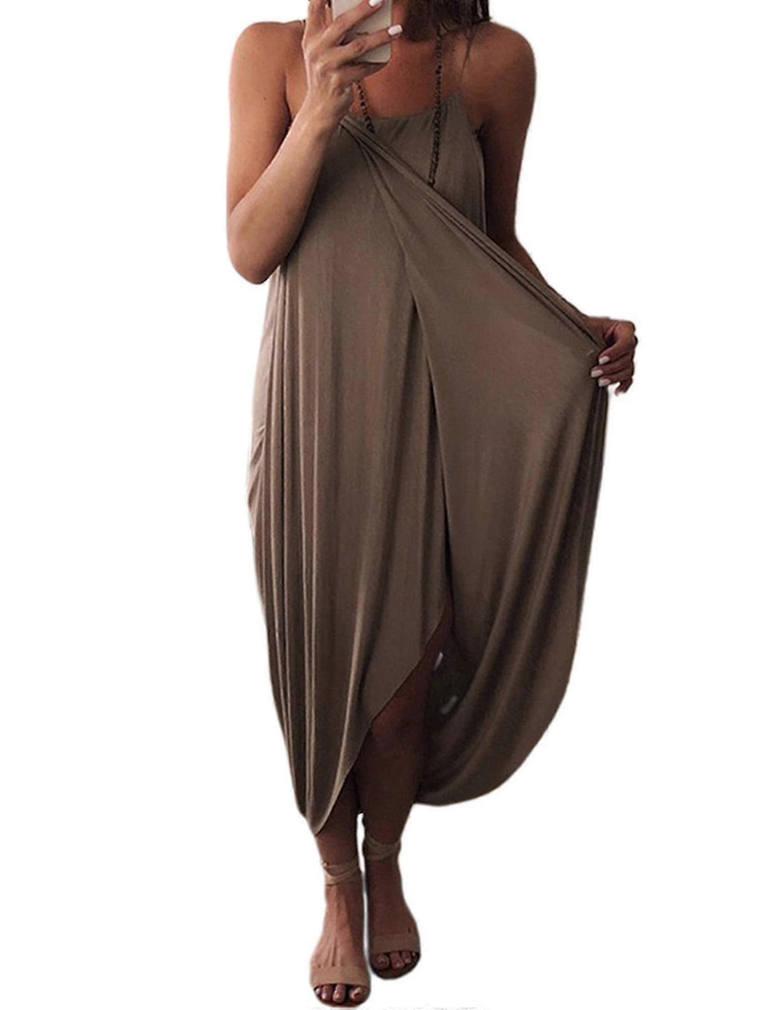 Women Solid Color Crew Neck Maxi Dress Summer Beach Sleeve Sundress Front Slit