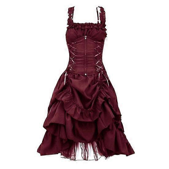 Women Cosplay Dress Gothic Style Witch Layered Ruffle Hem Mesh Halloween Party Costume Lace-up Strap Collarless Zipper Sleeveless A-line Dress