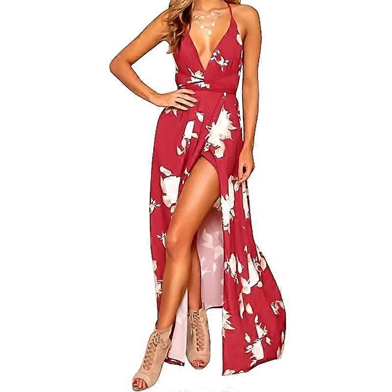 Women Summer Maxi Dress Solid Color Sexy Deep V-Neck Sleeveless Spaghetti Strap Backless High Split Long Sundress Vestidos