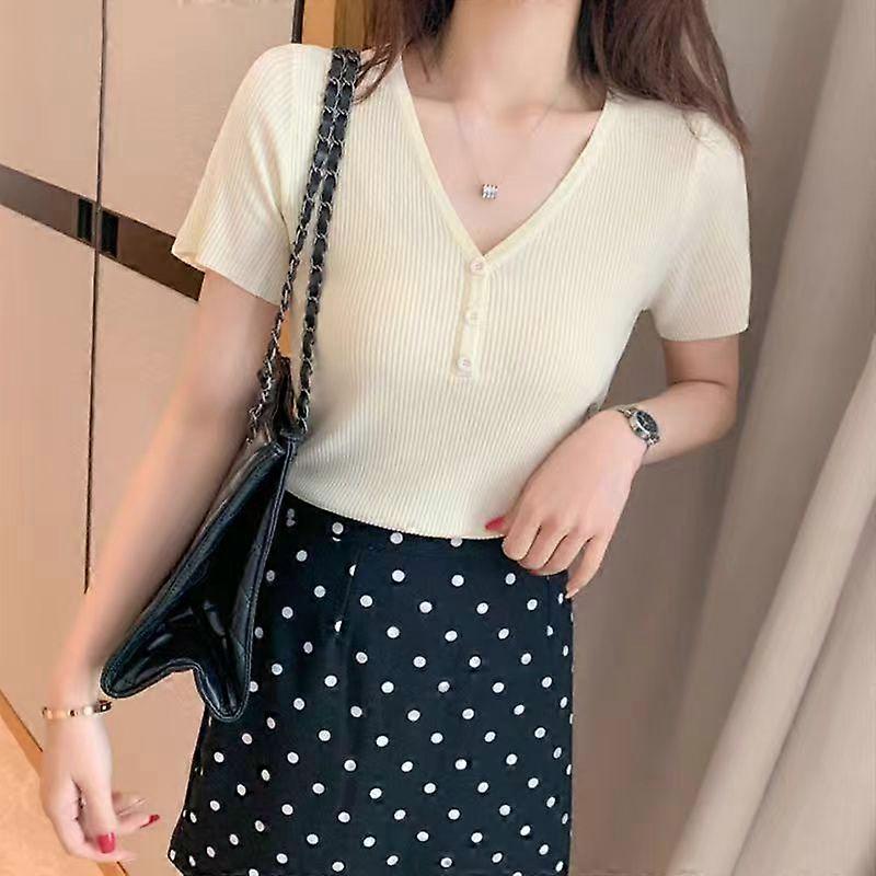 Women Summer V-Neck Short Sleeve Knitted Thin Sweater Shirt Top Short Sleeve Slim Bottoming Button Inner Outer Wear Solid Color