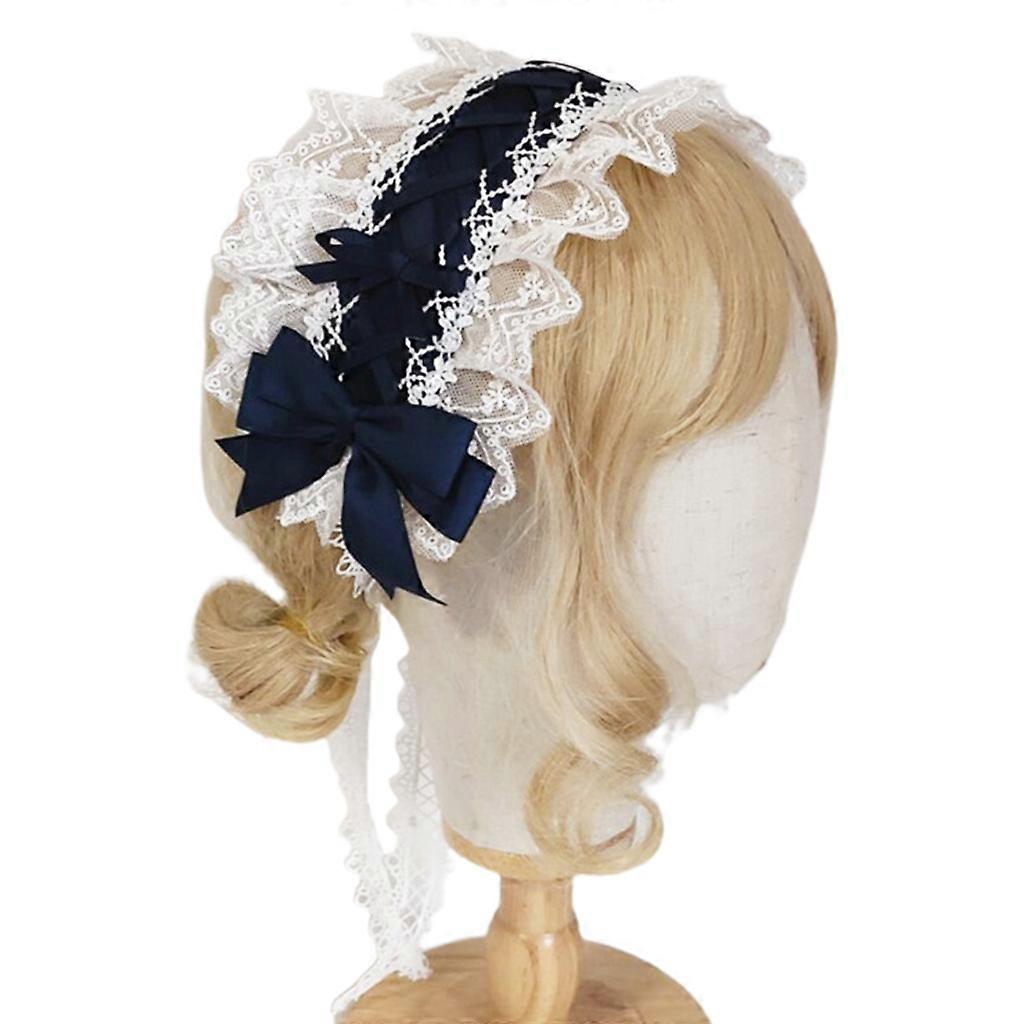 Women Ruffles Lace Hair Hoop Lolita Headband Bowknot with Ribbon Cosplay Props Maid Anime Headdress Accessories Navy