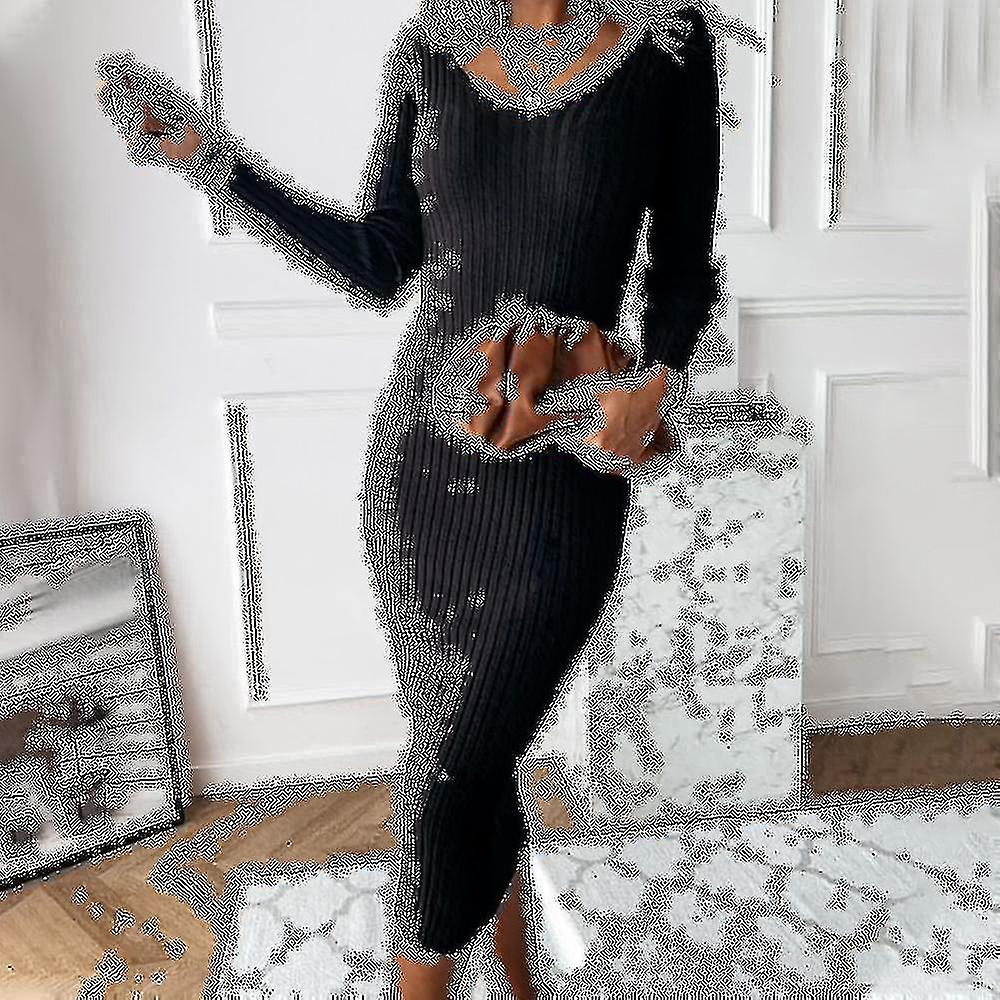 Women Ribbed Knitted V-neck Long Sleeve Bodycon Sweater Stretch Slim Fit Midi Dress
