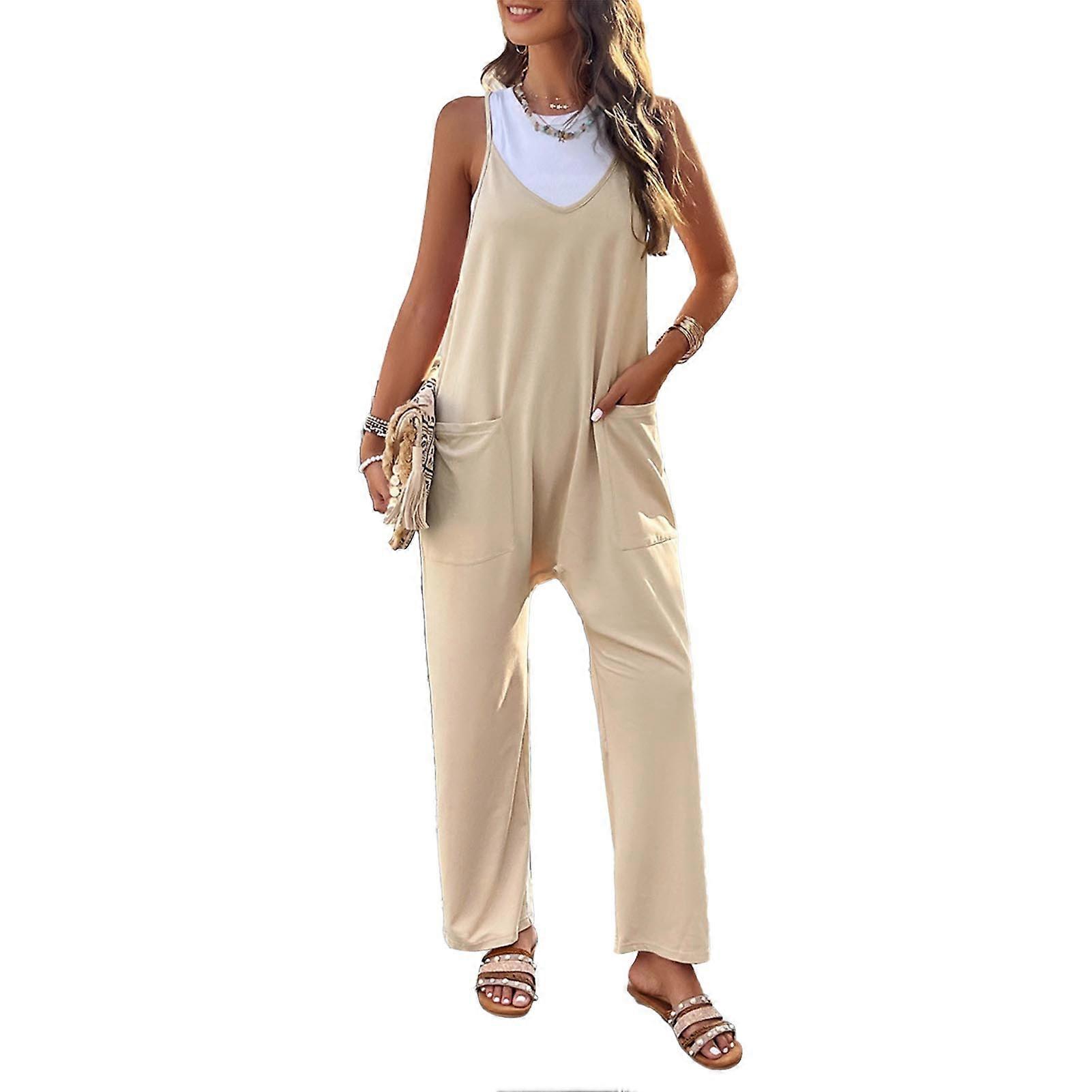 Women Spaghetti Strap Jumpsuit Loose Fit Casual V Neck Wide Leg Sleeveless Overalls with Pockets Apricot S