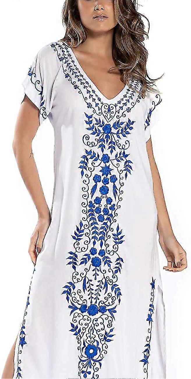 Women Embroidery Short Sleeve Bikini Swimsuit Cover Up Side Split Beach Dress