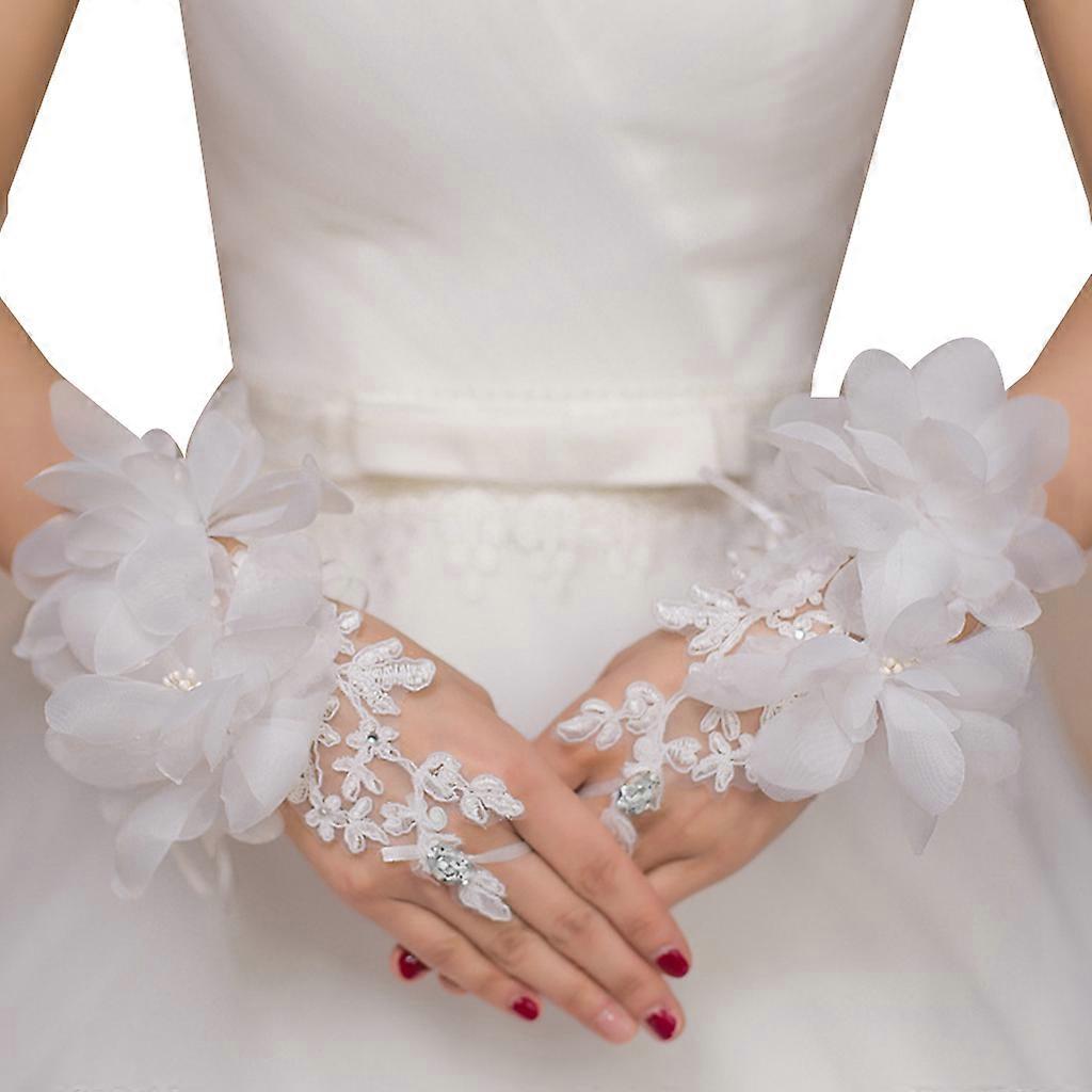 Women Embroidery Lace Fingerless Gloves Artificial Flower for Rhinestone Beads Wedding Bridal Sunscreen Formal Short Mit White