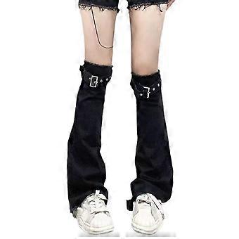 Women Chic Black Leg Sleeves with Eyelet Straps Harajuku Y2K Girl Punk Distressed Jeans Leg Warmer Over Knee Long Socks Black