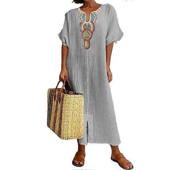 Women Maxi Dress Bohemian Embroidered V Neck Short Sleeves Embroidery Daily Wear Split Ankle Length Lady Dress Women Clothes