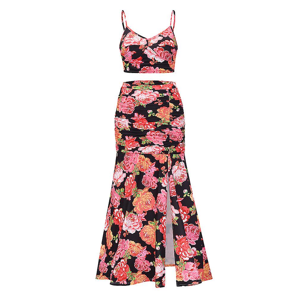 Women Summer Dress Spaghetti-strap Floral Print Pleated Slit Sexy Two-piece Suit Dress Plus Size Women's Clothing