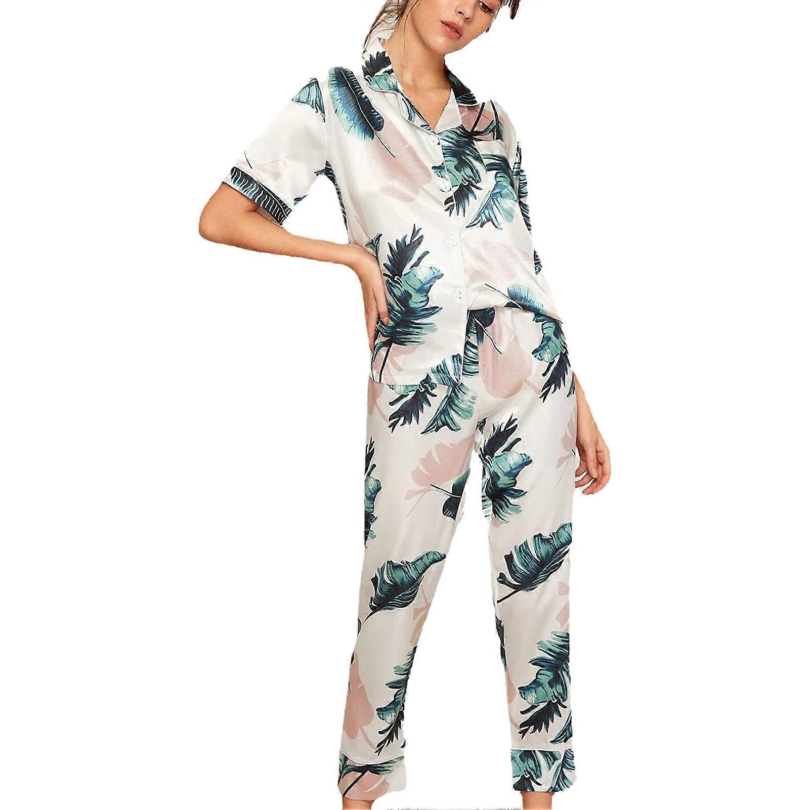 Women Two Piece Pajamas Silky Short Sleeve Top Pant Set V Neck Button Down Fashion Summer Sleepwear Loungewear