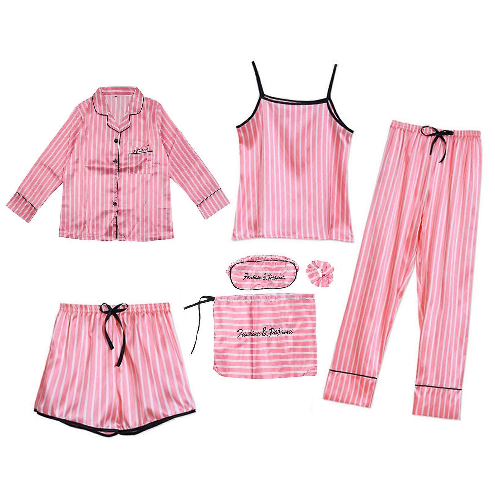 Women 7 Pieces Silky Pajamas Set Pink Striped Print Long Sleeve Shirt Camisole Shorts Pants Sleepwear Home Loungewear with Eye Mask Bag XL