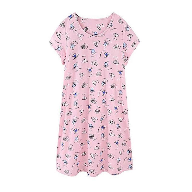 Women Nighties Short Sleeve Above Knee Soft Cotton Nightdress Ladies loose Cute Animal Floral Print Summer Loungwear Sleepwear,pink cup