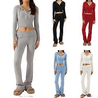 Women Y2k Knit 2 Piece Outfits Long Sleeve Zip Up Hooded Crop Sweater And Pants Tracksuit Lounge Set DG