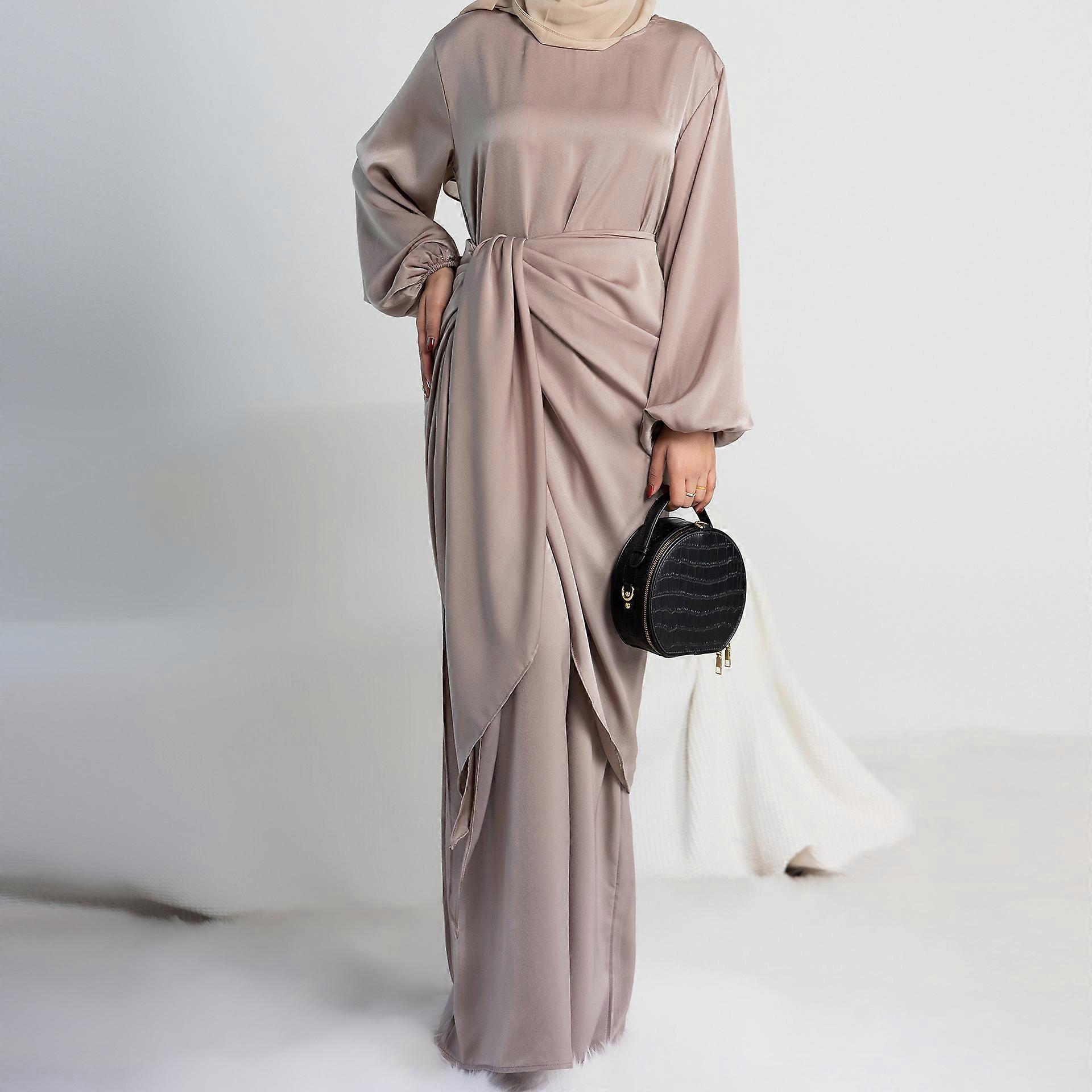 Satin Muslim Dress Women Abaya 2 Piece Set Morocco Party Kaftan Long Robe with Wrap Skirt Islamic Dubai Turkish Modest Outfit