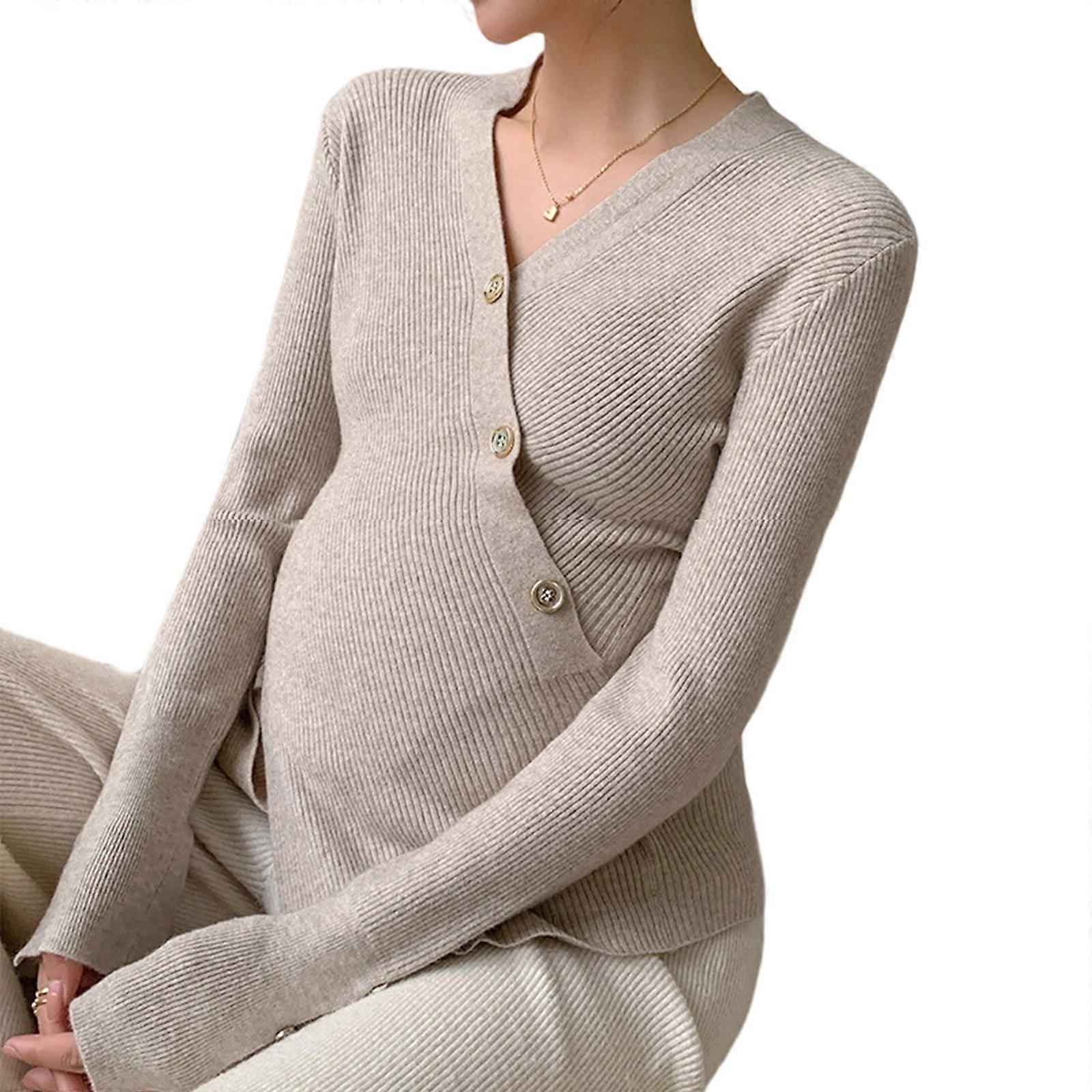 Maternity Sweater Soft Stretchy Knit Wear Comfortable Pregnancy Clothing For Women Knitting Polyester Fabric Oatmeal color XL