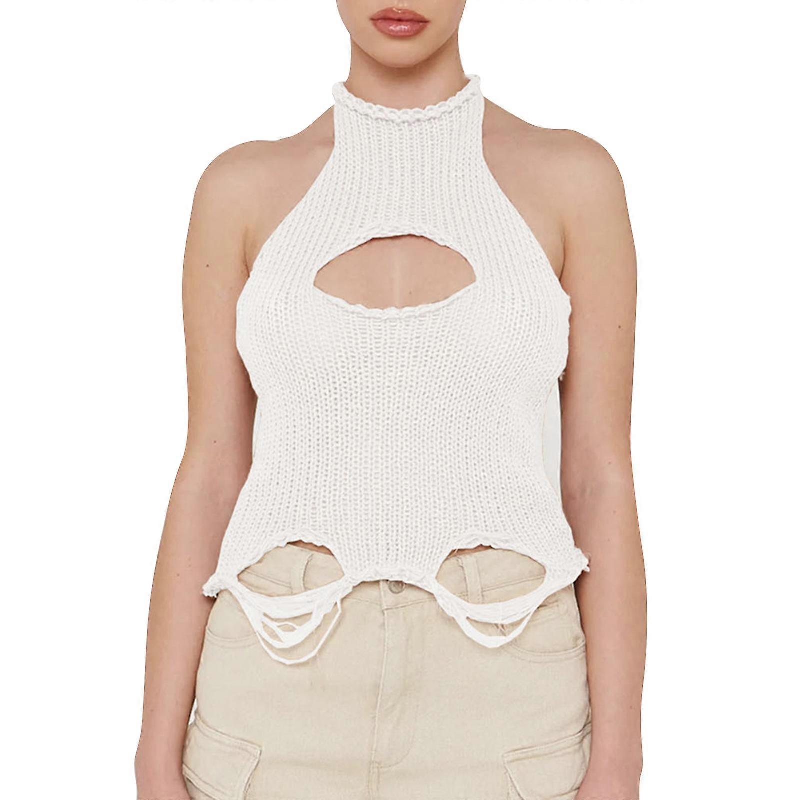 Pullover Knit Hollows Sleeveless Top Solid Color Bodycon Sexy Shirts Solid Color High Neck Vintages Shirts for Daily White XL